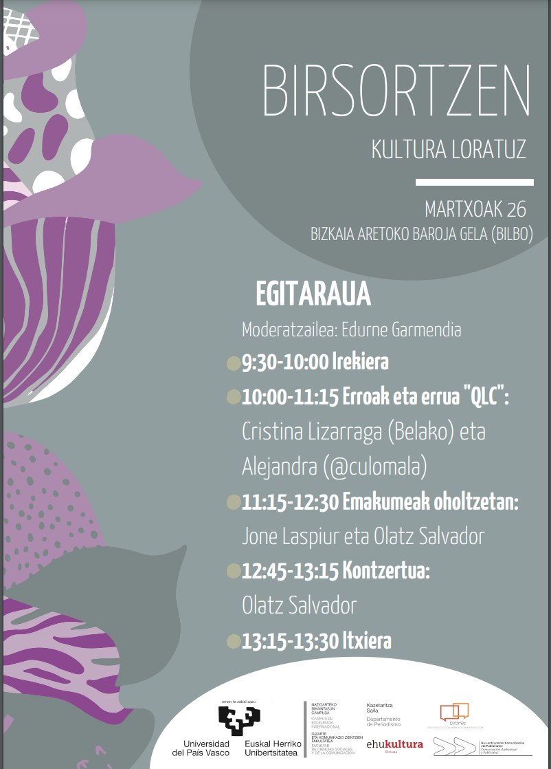 Goizeko 9:30etan hasi eta 13:30ak arteko iraupena izango du. Ekitaldia dinamizatzearen ardura Edurne Garmendia Gaztea Irratiko esatariak izango du. Irekiera, Gorka Moreno Márquezek, Bizkaiko Campuseko errektoreodeak eta Simon Peñak, Gizarte eta Komunikazio Zientzien Fakultateko dekanoak, egingo dute eta honen bidez emango zaio hasiera goizari. Ostean, Cristina Lizarraga Belako talde mungiarraren abeslariak unibertsitatetik irten eta emakume desberdinen testigantzak bildu eta ahotsak aditzera ematen dituen “Quítame la culpa” fanzinea idatzi arte izandako ibilibidearen inguruan hitz egingo du. Honekin batera, fanzinearen ikustrazioaz arduratu den Alejandra edo “@culomala” bezala ezaguna den ilustratzailea ere arituko da hizketan.