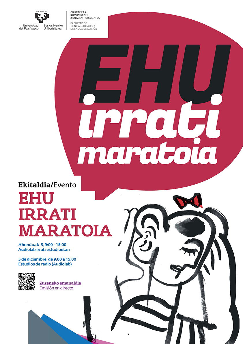 EHU Irrati Maratoia 2023 Fecha: 5 de diciembre de 2023 Hora: entre las 09.00 y las 15.00 horas Lugar: Audiolab, Plaza Mikel Laboa y canal de Youtube. Redes Sociales: @EHUirratimarato en X, EHU irrati maratoia en Facebook, y EHU irratimaratoia en Instagram.